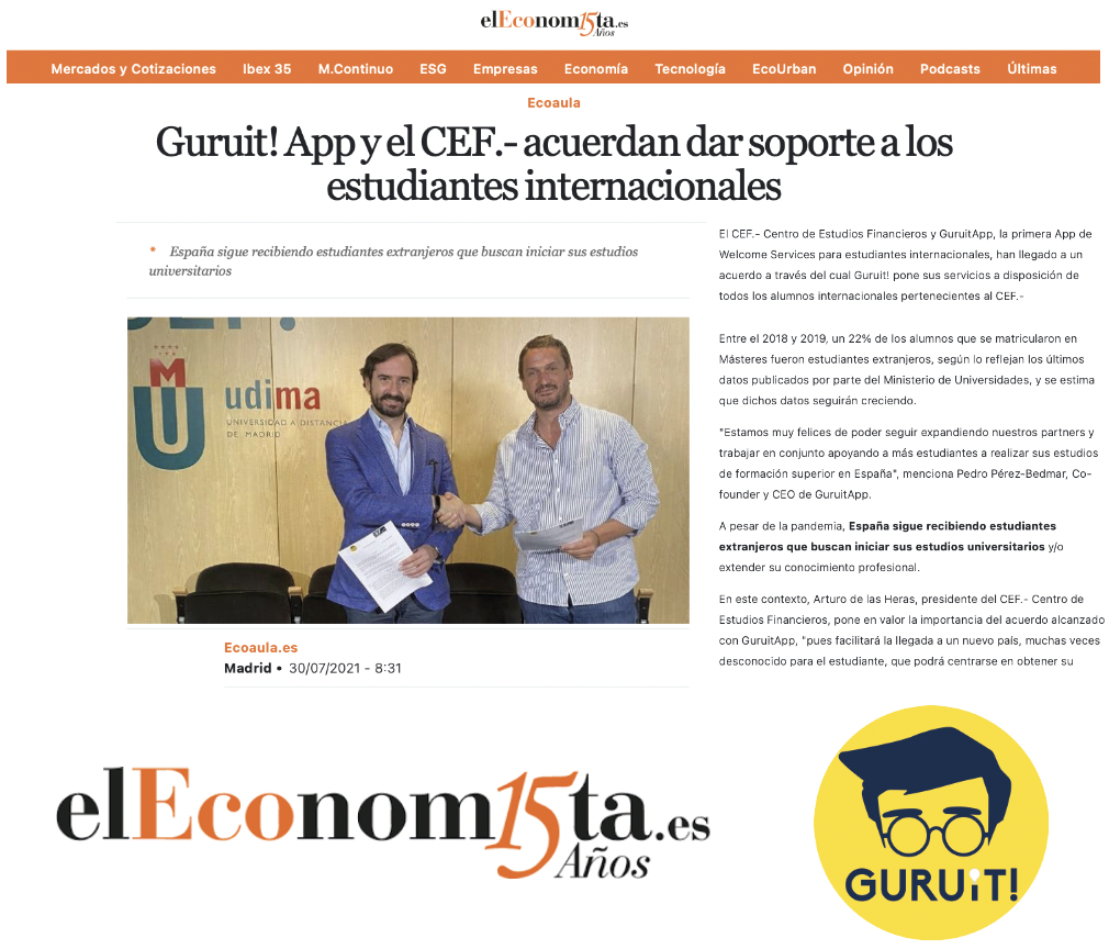 El Economista hace referencia al nuevo acuerdo que ha logrado GuruitApp con el CEF, para darle soporte a sus estudiantes internacionales.