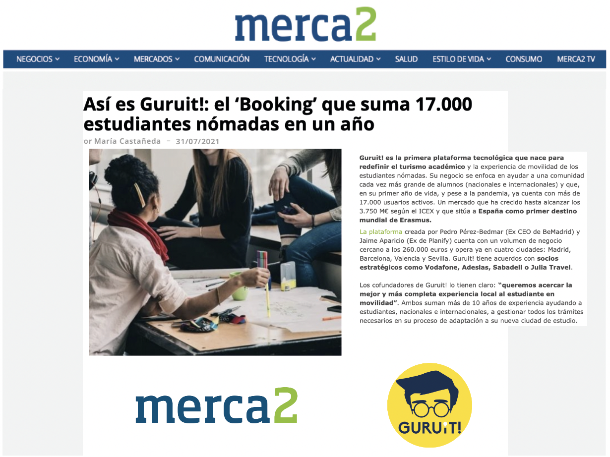 Merca2 diario digital de análisis sobre Empresas y Economía cataloga a Guruit!App, la primera App de Welcome Services para estudiantes internacionales, como la primera plataforma tecnológica que nace para redefinir el turismo académico que suma mas de 17.000 estudiantes en nuestro primer año de apertura.