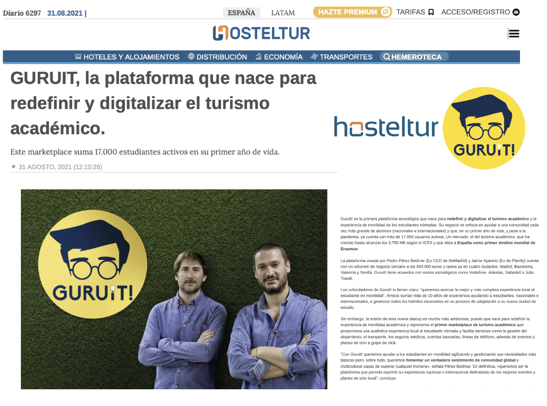 Hosteltur portal digital de noticias de turismo para profesionales, menciona a Guruit! como la plataforma que nace para redefinir y digitalizar el turismo académico, cuenta con mas de 17 mil usuarios activos pese al año después de su primer año de vida.
