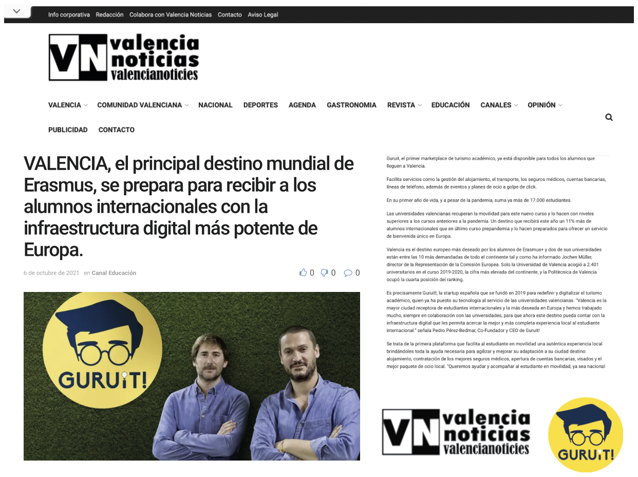 El diario digital Valencia Noticias publicó a Guruit!App como la infraestructura digital más potente de Europa en servicios ofrecidos a estudiantes internacionales.